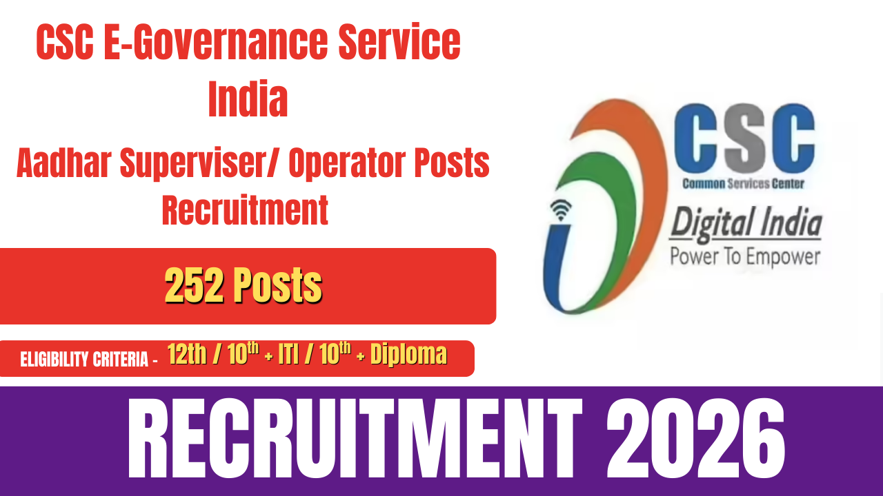 CSC e-Governance Services India has released the official notification for Aadhaar Operator / Supervisor Recruitment 2026. A total of 252 vacancies have been announced for the posts of Aadhaar Supervisor and Operator. Eligible and interested candidates can submit their applications online through the official website of CSC e-Governance Services India.