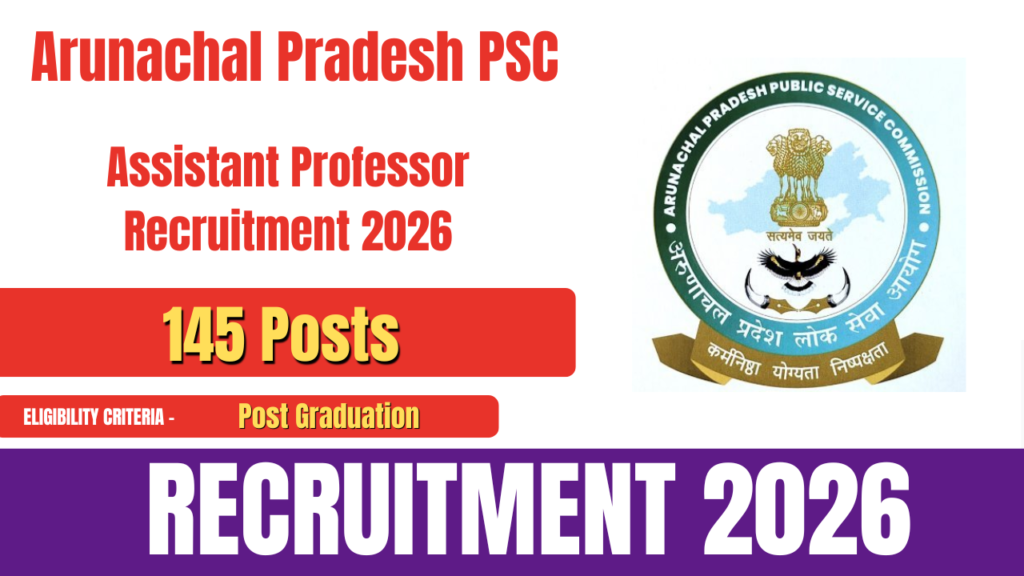 Arunachal Pradesh Public Service Commission (APPSC) has released the official notification for the recruitment of Assistant Professor posts. This recruitment drive is being conducted for a total of 145 vacancies. Eligible and interested candidates can apply online through the official website of Arunachal Pradesh PSC at https://appsc.gov.in/. The online application process for Arunachal Pradesh PSC … Continue reading Arunachal Pradesh PSC Assistant Professor Recruitment 2026