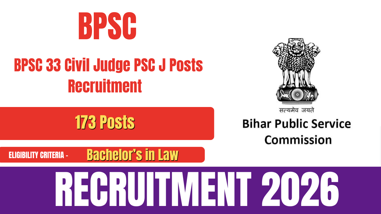 The Bihar Public Service Commission (BPSC) has released the official notification for the 33rd Judicial Services Competitive Examination 2026 under BPSC Civil Judge (PCS J) Recruitment 2026. This recruitment drive is being conducted for a total of 173 Civil Judge vacancies. Eligible and interested candidates can apply online by visiting the official BPSC website and referring to the detailed notification. The online application process commenced on 25 February 2026 and will remain open until 18 March 2026.