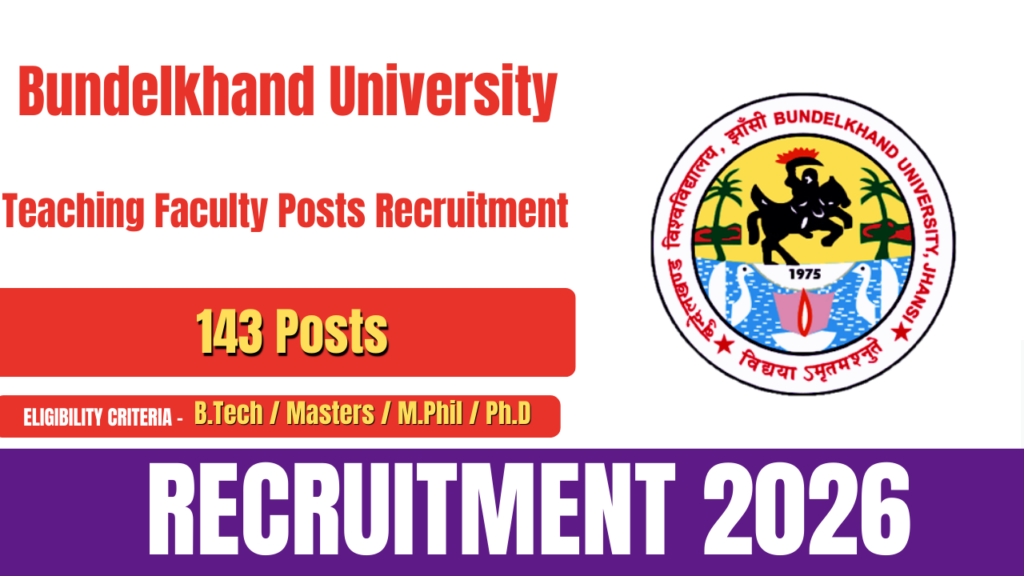 The Bundelkhand University has released an official notification for the Bundelkhand University Teaching Faculty Recruitment 2026. A total of 143 teaching faculty vacancies have been announced. Eligible and interested candidates can apply online through the official website of Bundelkhand University. The online application process began on 12 February 2026 and will continue until 21 March … Continue reading Bundelkhand University Teaching Faculty Recruitment 2026- How to Apply