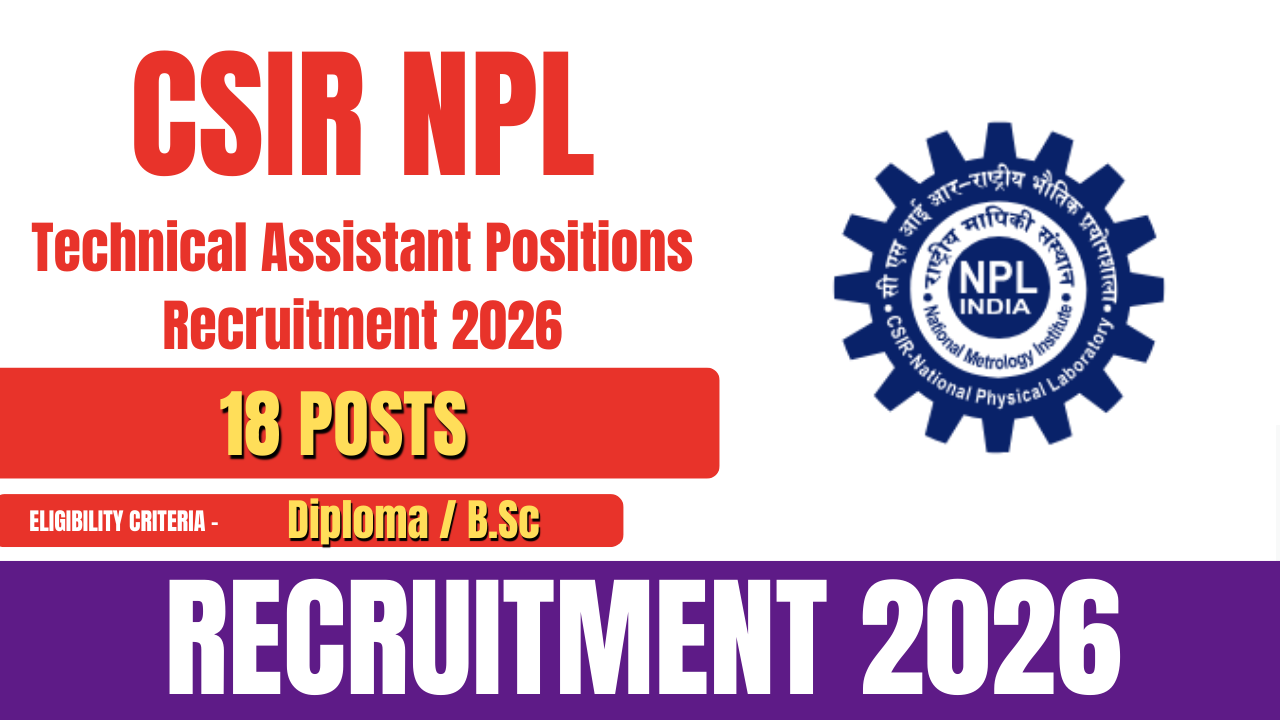 CSIR–National Physical Laboratory (CSIR NPL) has released an official notification for the recruitment of Technical Assistant posts. A total of 18 vacancies are available under this recruitment. Candidates possessing a B.Sc. or Diploma qualification are eligible to apply.