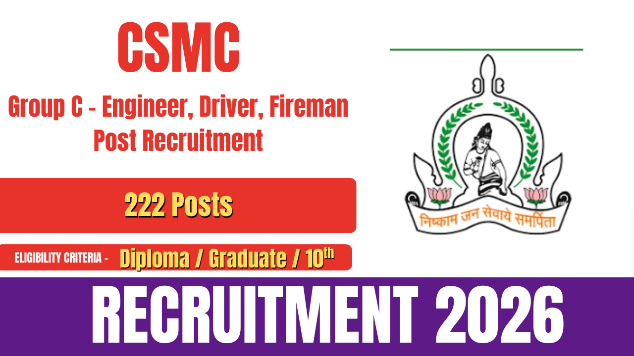 Chhatrapati Sambhajinagar Municipal Corporation (CSMC) has issued the official notification for CSMC Group C Recruitment 2026. The recruitment drive aims to fill 222 vacancies for various Group C posts, including Junior Engineer, Driver Operator, Fireman, and other positions. Eligible and interested candidates can submit their applications online through the official website of CSMC.