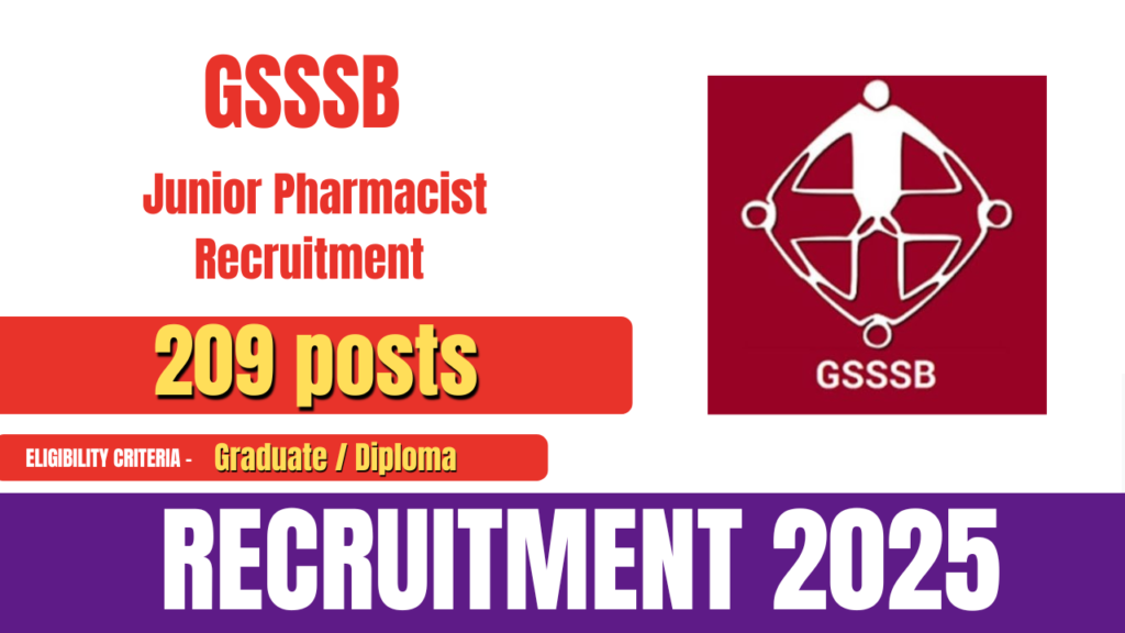 The Gujarat Subordinate Services Selection Board (GSSSB) has released the official notification for the recruitment of Junior Pharmacist posts. A total of 209 vacancies have been announced under this recruitment. Eligible and interested candidates can apply online through the official GSSSB website. The online application process for GSSSB Junior Pharmacist Recruitment 2025 has started from … Continue reading GSSSB Junior Pharmacist Recruitment 2025- How To Apply
