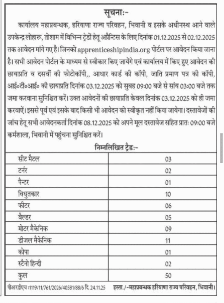 The Haryana Roadways Bhiwani Depot has released an official notification for the recruitment of 50 apprentice posts. Eligible and interested candidates can submit their applications online through the official website of Haryana Roadways Bhiwani.