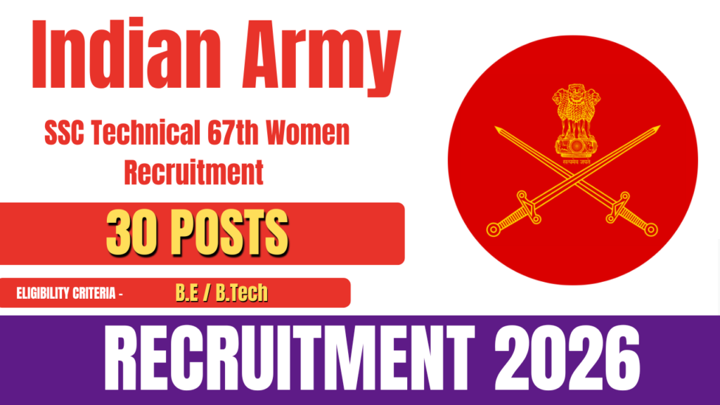 Join Indian Army (Bhartiya Sena) Indian Army SSC Technical 67th Women Recruitment 2026, Eligibility, Age Limit, Fees, Selection, Salary, Apply Online, Join Indian Army has released the official notification for SSC Technical 67th Women Recruitment 2026. This recruitment is for a total of 30 posts. All eligible and interested candidates can apply online by visiting … Continue reading Indian Army SSC Technical 67th Women Recruitment 2026- How to Apply