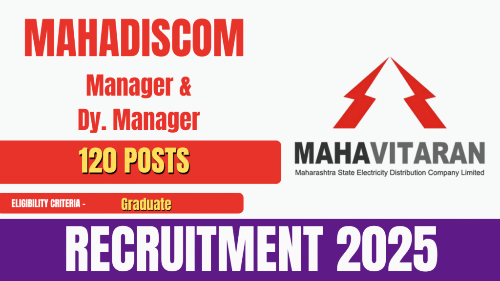 Maharashtra State Electricity Distribution Company Limited (MAHADISCOM) has released an official notification for the recruitment of Manager, Deputy Manager, Senior Manager, and Disturbance Officer posts. A total of 120 vacancies have been announced. Eligible and interested candidates can submit their applications online through the official website of MAHADISCOM. The application process for MAHADISCOM Manager & … Continue reading MAHADISCOM Manager & Dy. Manager Recruitment 2025