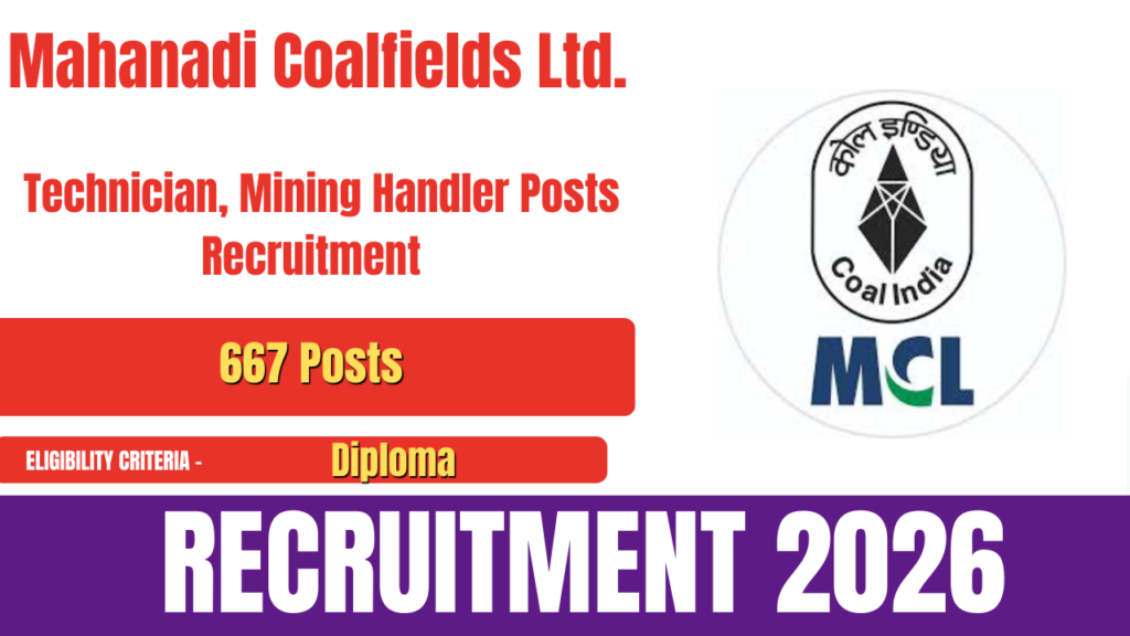 The Mahanadi Coalfields Limited (MCL) has released an official notification for MCL Recruitment 2026. The recruitment drive is being conducted for the posts of Technician, Mining Sirdar/Mining Handler, and other positions. A total of 667 vacancies have been announced. Eligible and interested candidates can submit their applications online through the official MCL website. The online … Continue reading MCL Recruitment 2026- Apply for Technician, Jr. Overman, Mining Sirdar and Other Posts