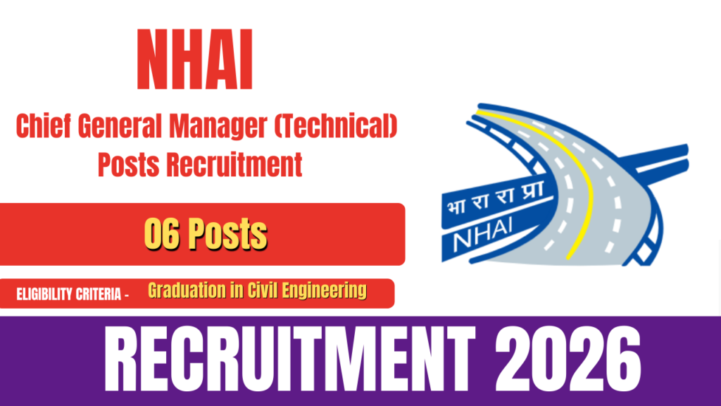 The National Highways Authority of India (NHAI) has released the official notification for Chief General Manager (Technical) Recruitment 2026. This recruitment drive is being conducted to fill a total of 06 Chief General Manager (Technical) posts. Eligible and interested candidates can apply online through the official website of NHAI. The online application process for NHAI … Continue reading NHAI Chief General Recruitment 2026- How to Apply