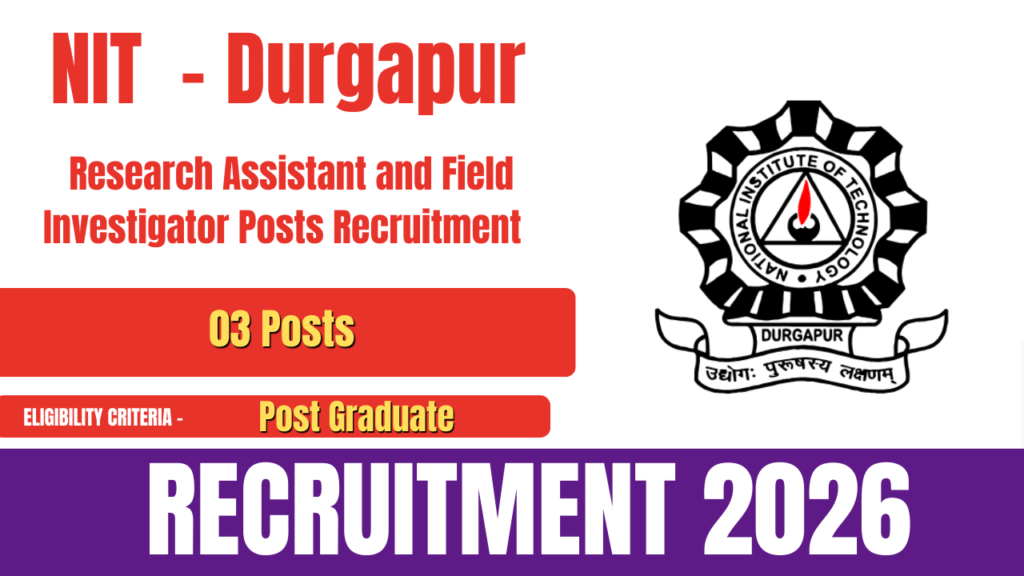 The National Institute of Technology Durgapur (NIT Durgapur) has released an official notification for NIT Durgapur Recruitment 2026. The recruitment is being conducted for the posts of Research Assistant and Field Investigator. A total of 03 vacancies have been announced. Eligible and interested candidates can apply by visiting the official website of NIT Durgapur or … Continue reading NIT Durgapur Recruitment 2026- Apply for Research Assistant and Other Posts