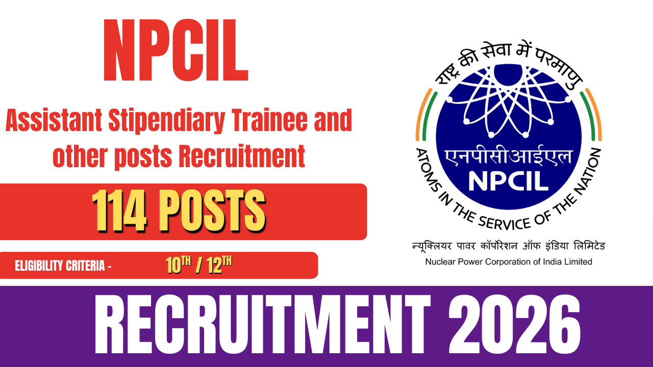 Nuclear Power Corporation of India (NPCIL) NPCIL Various Post Recruitment 2026, Eligibility, Age Limit, Fees, Selection, Salary, Apply Online, NPCIL has released an official notification for the recruitment of 114 Assistant Stipendiary Trainee and other posts. Candidates with 10th, 12th, graduate, and diploma degrees are eligible to apply. All interested candidates can apply online by visiting the official website of NPCIL.