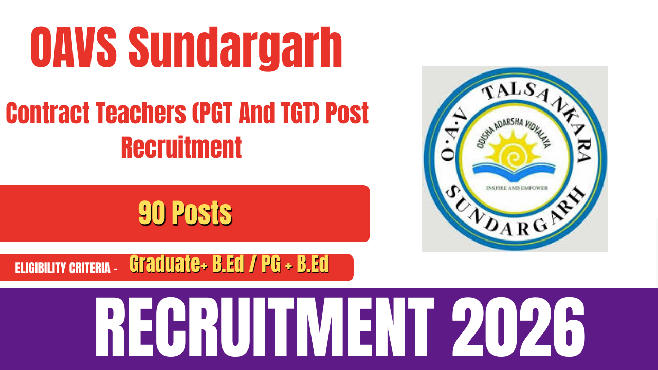 Odisha Adarsha Vidyalaya Sangathan (OAVS), Sundargarh, has released an official notification for OAVS Sundargarh Teachers Recruitment 2026. The recruitment is being conducted for Contract Teachers (PGT and TGT) in various Odisha Adarsha Vidyalayas located in Sundargarh district. A total of 90 vacancies have been announced.