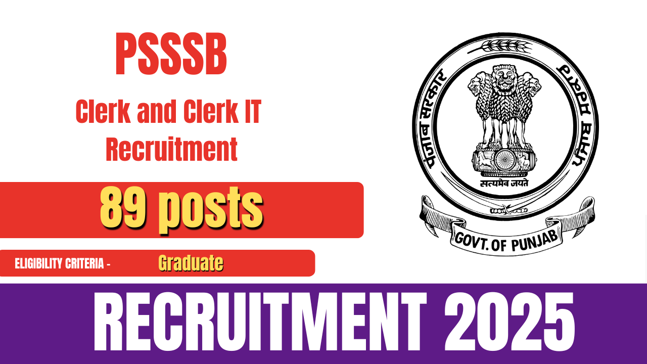 The Punjab Subordinate Services Selection Board (PSSSB) has released the official notification for the recruitment of Clerk and Clerk IT posts. A total of 89 vacancies have been announced under this recruitment. Eligible and interested candidates can submit their applications online by visiting the official PSSSB website.