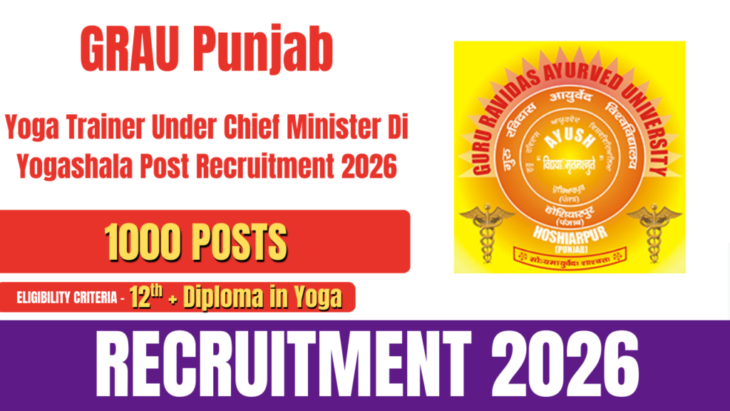 Guru Ravidas Ayurved University, Punjab (GRAU) has released an official notification for the recruitment of Yoga Trainer posts under the Chief Minister Di Yogashala Project. A total of 1000 vacancies have been announced for this recruitment. Eligible and interested candidates can submit their applications via email or by post. The application process for Punjab Yoga … Continue reading Punjab Yoga Trainer Recruitment 2026- How to Apply