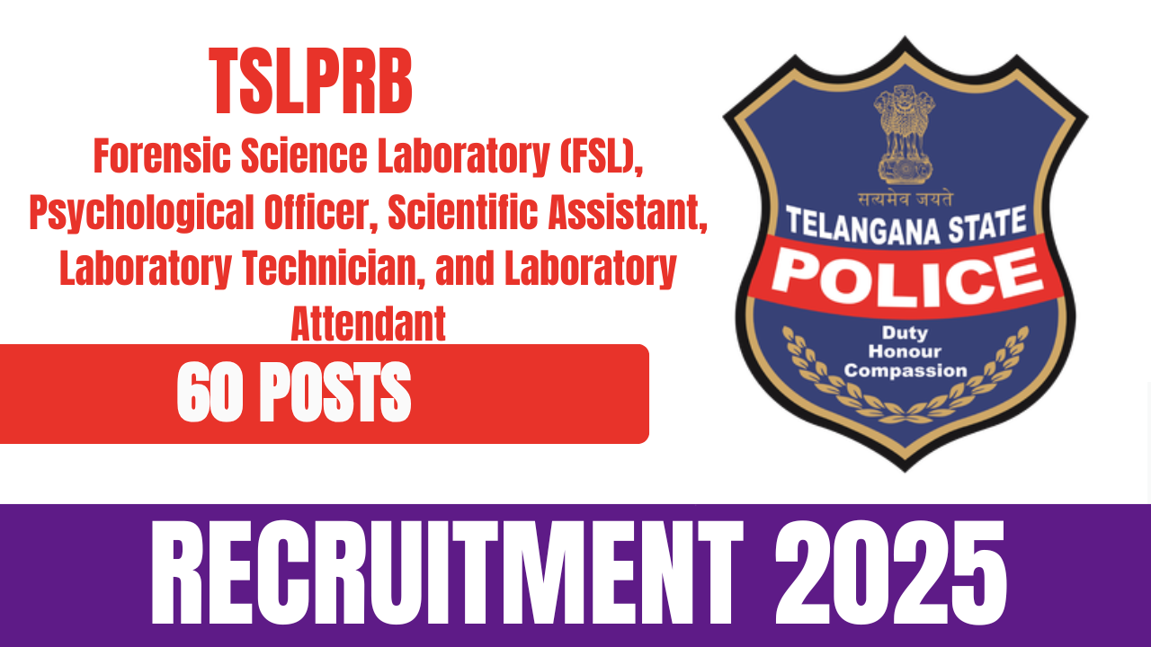 The Telangana State Level Police Recruitment Board (TSLPRB) has released the official notification for TSLPRB FSL Recruitment 2025. The recruitment drive aims to fill 60 vacancies across various posts in the Forensic Science Laboratory (FSL), including Psychological Officer, Scientific Assistant, Laboratory Technician, and Laboratory Attendant. Eligible and interested candidates can apply online through the official website of TSLPRB.