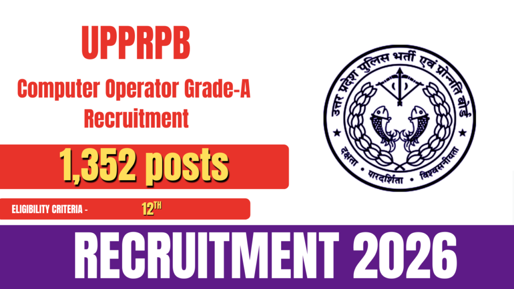 The Uttar Pradesh Police Recruitment and Promotion Board (UPPRPB) has issued the official notification for recruitment to the post of Computer Operator Grade-A. A total of 1,352 vacancies have been announced. Interested and eligible candidates can submit their application forms online through the official UPPRPB website. The online application process for UPPRPB Computer Operator Grade-A … Continue reading UPPRPB Computer Operator Grade A Recruitment 2026- How To Apply