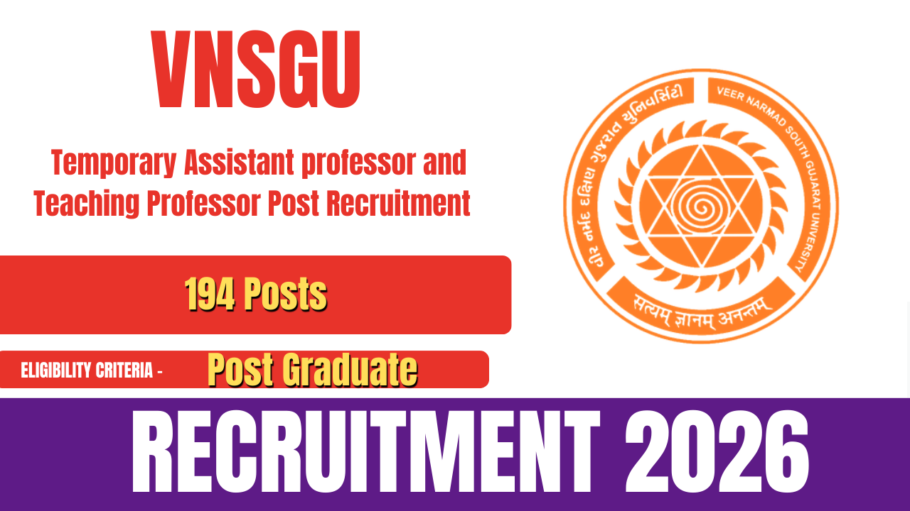 Veer Narmad South Gujarat University (VNSGU) has released the official notification for VNSGU Recruitment 2026. The recruitment drive is being conducted for Temporary Assistant Professor (TAP), Temporary Teaching Assistant, and Tutor positions. A total of 194 vacancies have been announced.